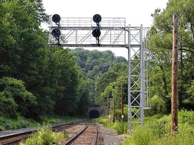 A short distance to the west, the Lehigh Valley Railroad passes through the same line of hills via the 3000+ foot long Pattenburg Tunnel. In 2003 the tunnel had recently been single tracked for double stack clearance purposes with the entire length falling within the limits of the new interlocking, CP-64.