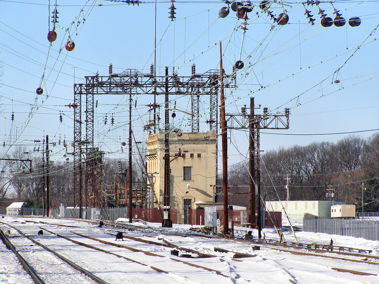 Zooming in along the trailing point ladder crossover we see the 1938 substation next to the original 1915 substation which is no longer in service. If you look at the upper right hand corner of the picture you'll notice the triple set of centenary hangers that stand out in every photo taken here for the last 100 years.