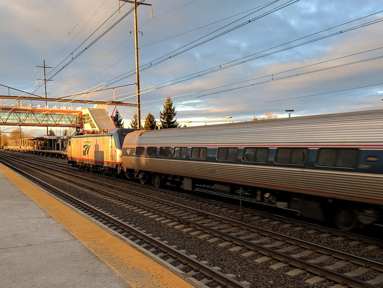 We begin the day at Hamilton, NJ's NJT station with an Amtrak Acela Express trainset running south on the local track with power cars #2025 and #2023.