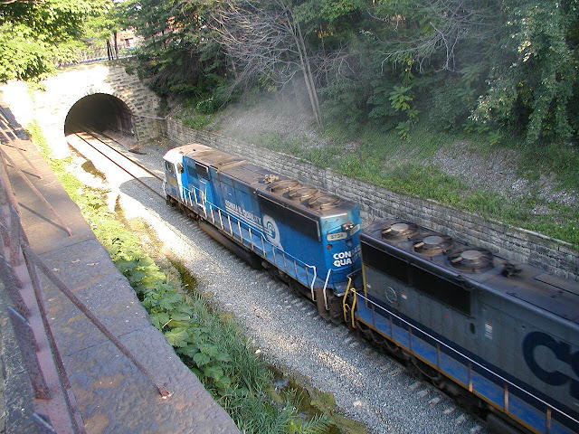 Back on the Belt Line I caught a third AC6000, #5010, along with Conrail painted SD60I #8754 following behind. Note the amount of diesel exhaust pouring out of the Huntingdon Ave tunnel. I wasn't exaggerating about the significance of the Belt Line grades and often times long coal trains would be moving barely faster than a walk.