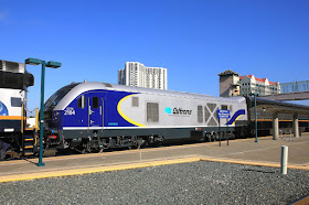 A Southbound Amtrak Capitol Corridor train is scheduled to arrive right before the Zephyr pulls in. This was being powered by a typical Amtrak California F59PHI (#2010), however behind it was brand new SC44 Charger #2104.